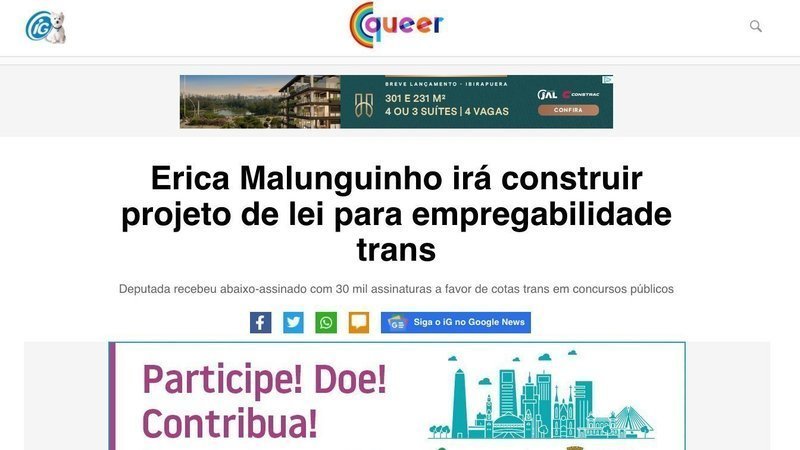 News alertPELA INCLUSÃO DE PESSOAS TRANS NO MERCADO DE TRABALHO!Saiu no IG! Erica Malunguinho irá construir projeto de lei para empregabilidade trans
