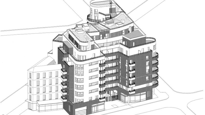 Voici la vue de l'immeuble qui prendra place sur notre place, l'immeuble le plus petit est celui qui abrite le bar PMU ...