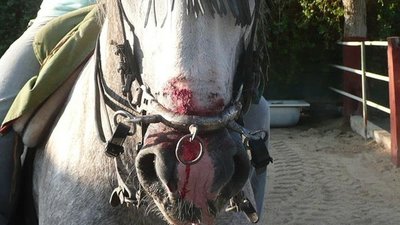 The spanish iron noseband (“serreta” in spanish) in an element of punishment used for years to “dominate” horses. This utensil is placed on the horse´s nose to control from there. It is an iron in the form of an arch, serrated by the part in contact with the nose and with two rings where the reins are hooked to be able to direct. The use when riding a horse or even rope, always produces great wounds and even causes the rupture of the nasal septum of this, producing in the horse great pain when being guided.