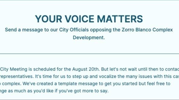Petition updatePetition Against the Construction of the Zorro Blanco Apartment ComplexContact Your City Council Members!