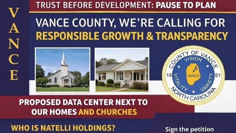 We, the undersigned residents of Vance County, respectfully demand an immediate one-year moratorium on all new and pending applications for data centers, including the proposed site located on Hwy 158 Business with an additional entrance on Poplar Creek Road in Henderson.