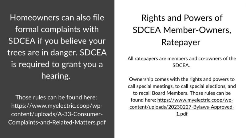 Homeowners can file a formal complaint with SDCEA if you believe your trees are in danger, and for other reasons listed in the Bylaws. SDCEA is required to grant you a hearing.