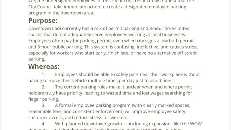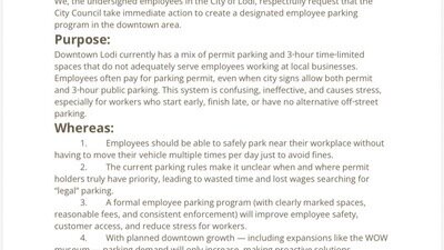 This is a petition for downtown employees of Lodi, CA who feel as though the parking situation has become a major issue. Stop ticketing employees on the clock as well as find a system for safe, dedicated parking for staff. Employees cannot safely walk long distances to their cars at nighttime. For more information attend City council meeting April 15th 7pm!