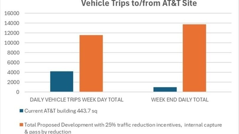 Based upon the Transportation Impact Study submitted by the developer, daily Saturday traffic will increase from 980 trips to 13,773 trips to/from the AT&T site! (page 68). That is a 1305% increase of trips generated!