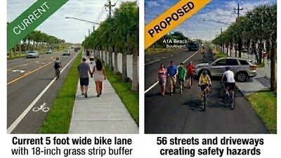 The proposal removes the existing east side sidewalk and replaces it with a 12-foot-wide asphalt trail, creating serious safety concerns. Increased speeds from cycling enthusiasts combined with pedestrians going in both directions plus 56 driveways & side streets will lead to dangerous conflicts along one of our busiest corridors. What is wrong with our current sidewalk & bike lane on either side of A1A Beach blvd;? It works very well and the width of these A1A Beach blvd. Bike lanes mirror those on U S 1 and A1A with bike symbols. Our residents seem to the like the current setup very well and it is what defines the character our City. Alternatives were studied such maintaining the alignment on A1A yet it shifts to to A1A Beach boulevard which requires crossing at a complicated intersection near Win Dixie.