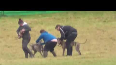 A hare can be seen in the clutches of a coursing official following a mauling and this animal is clearly having its neck broken.