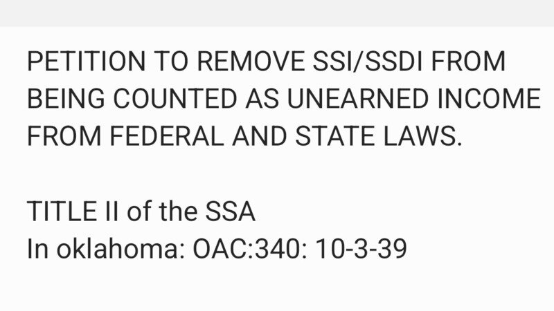 Laws we want changed are below. We want them to not consider ssi/ssdi as income per OAC 340:10-3-39 section 7. And a revision to title II of the SSA to remove disability and ssi from being counted as unearned income.