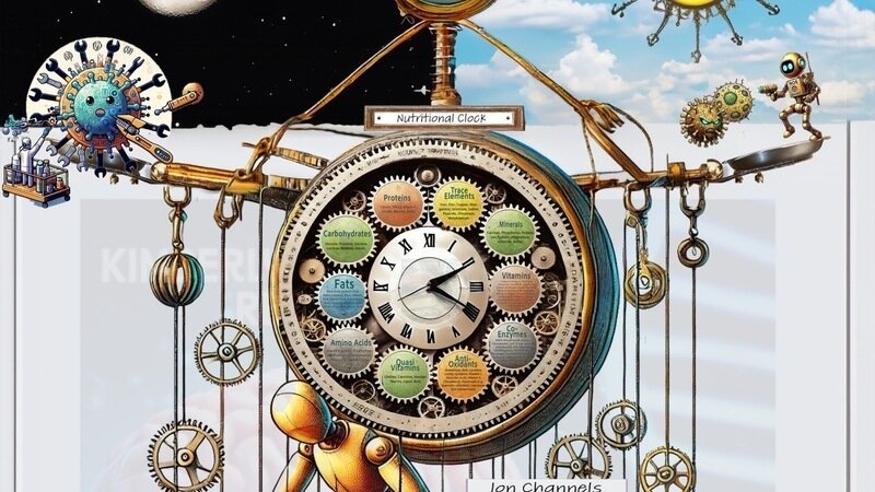 The verbiage on the original biochemical network is not easily accessible, so I created this visual representation. The image is a detailed and symbolic illustration of the biochemical pathways that maintain the balance of functional parts within the human body. It visually represents how genes carry instructions for creating proteins, which then act as gears within a clock mechanism to keep the body functioning. The pathways begin as nutrients we get from food and result in chain-link reactions that create products, which then act on ion channels to keep us functioning. These pathways are influenced by the circadian rhythm, determined by visual input through the retina.