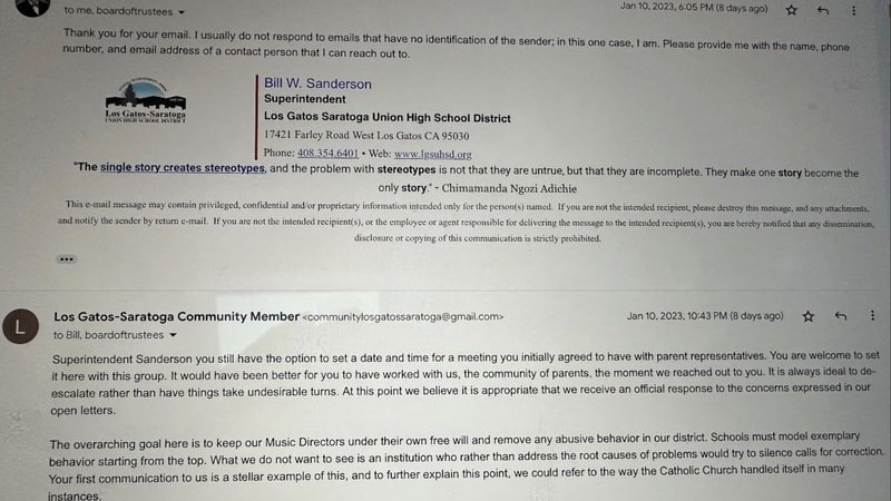 We look to these three fresh board member additions with hope, and they, in turn must ensure that Superintendent Sanderson does not mislead them or his community again. We are sorry they have ended up with a Superintendent they did not select and we are sorry that they have inherited an important problem that at present is being deplorably handled by Sanderson. Our recommendation is that his contract not be renewed and it would be wise he be prompted to tender his resignation on our behalf. This is a community request. He clearly is not here for building up the schools, he is on his way to destroying a department that is of great pride to Saratoga.