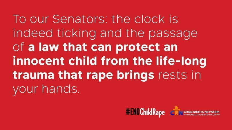 To our Senators: the clock is indeed ticking and the passage of a law that can protect an innocent child from the life-long trauma that rape brings rests in your hands.