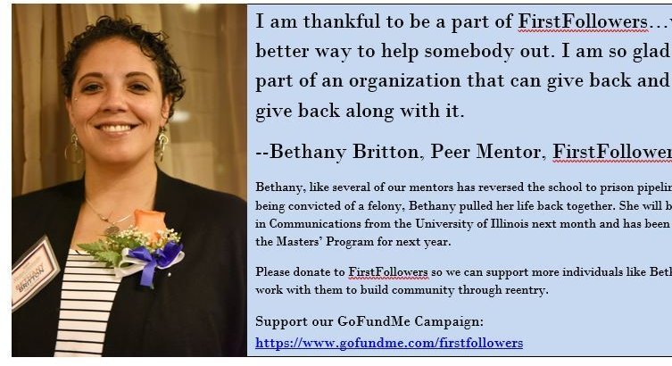 I ask you once again to please share my appeal for funding support for the FirstFollowers reentry program where I am the volunteer Co-Director in Champaign IL. Today I bring you the story of Bethany Britton who has recovered from addiction and a felony conviction and has just been accepted for the Fall term to the Masters Program at the University of Illinois Department of Social Work. She has been working with FirstFollowers for a year now and intends to dedicate her career to community development, particularly focusing on support for women who have histories of addiction and incarceration. I ask for your support so we can help other people with felony convictions advance and give back to the community, both via direct assistance to individuals and advocacy work to change policies and practices in the criminal justice and social services arena. I thank you for your support. Please share our GoFundMe link: gofundme.com/firstfollowers