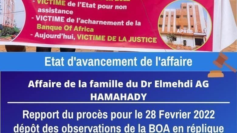 Nous tenons à vous remercier pour votre présence à nos côtés depuis le début de cette bataille. C’est avant tout grâce à vous que nous sommes arrivés à ce stade d’avancement. Nous vous faisons part de la suite de l’affaire en vous informant qu’après plusieurs reports, la BOA SA a déposé ses conclusions le 24 janvier 2022 pour réplique à notre assignation (pour demande d’annulation de la vente). Le lundi 28 février 2022 au tribunal de grande instance de Kati se tiendra l’audience. Nous sollicitons encore votre aide indispensable à l’aboutissement de cette bataille en partageant sur vos profils, statuts, groupes et réseaux sociaux l’information en faisant appel à une mobilisation sous toutes les formes possibles pour que cette injustice qui persiste depuis février 2012 ne passe pas inaperçue.