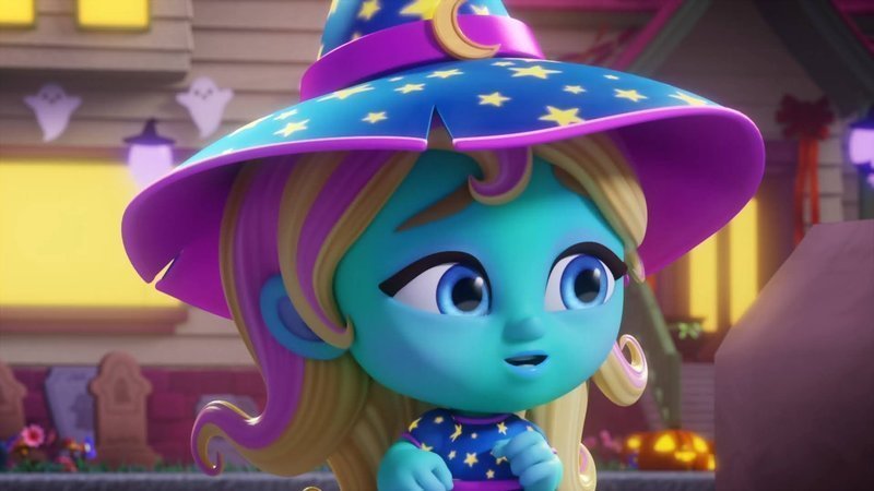 As a witch, Katya has blue-green skin, shoulder length blonde and pink hair, and blue eyes. She wears a blue dress with stars on it. She also wears a matching blue hat with a pink belt around it and a gold moon on it, purple and yellow striped socks and purple shoes like Zoe's shoes.