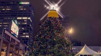 Place a Cincinnati Yellow Street Lamp on top of the fountain square Christmas Tree
