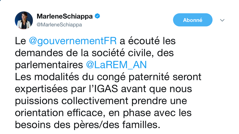 Marlène Schiappa Gerald Darmanin Agnès Buzyn et Muriel Penicaud ont demandé à l'IGAS d'étudier la possibilité d'allonger et de mieux rémunérer le congé paternité.