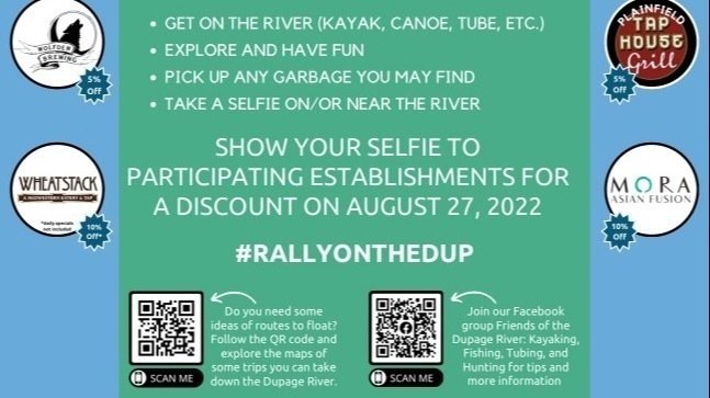 Good morning river supporters! It’s been a while since I’ve posted an update, but we have been very busy with the DuPage River. This coming Saturday 8/27/22 we will be hosting a rally on the river, the entire river, both East & West branches. We also have 8 amazing establishments on board to offer between 5 & 10% off your bill that day when you visit them and simply show them a selfie of you and your friends on the river. I am attaching the poster for you. If you are not on our Facebook page, please check it out. Every Saturday morning we give a weekend update on the current flow of the river, the weather for the weekend and any other important information regarding the river. We have had several meetings this summer with lawmakers, park district staff members, attorneys, mayors, and other friends who want the DuPage River to be accessible to everyone. Be on the lookout for more information on what the future plans are.