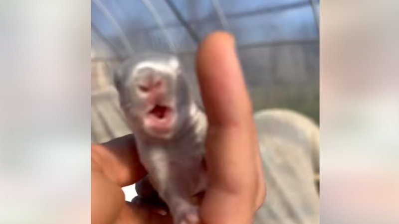 Baby bunny is severely distressed, squeaking, crying and struggling to escape while being choked, squeezed and poked. The babies are expecting to be fed, not cruelly handled.
