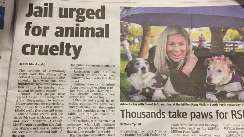 Actualización de la peticiónPlead to WA Government to review the Animal Welfare Act and enforce harsher penalties.Media coverage for Animal Welfare Act 2002 Review