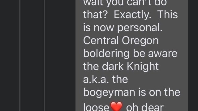 This message was recently sent to me from another local rock climber in Bend. Apparently Shawn is not only focused on the larger climbable rocks around town, he's now threatening to damage local boulders as well.