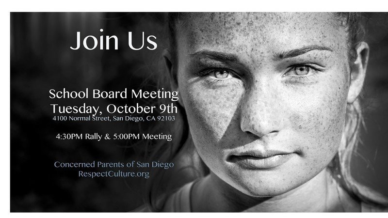 Your presence is requested at the next school board meeting on October 9th at 4100 Normal Street, San Diego, CA 92103.