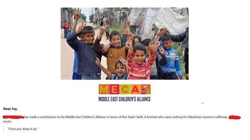 It's time to fulfil that pledge. Above, I attached a screenshot of my friend And's donation. If you feel comfortable, once you have donated, please send a screenshot of your donation in the amount of $29.99 (the retail price of The Life of a Showgirl) to either MECA, a mutual aid fund, or a Palestinian-led charity of your choosing to ivylear@proton.me.