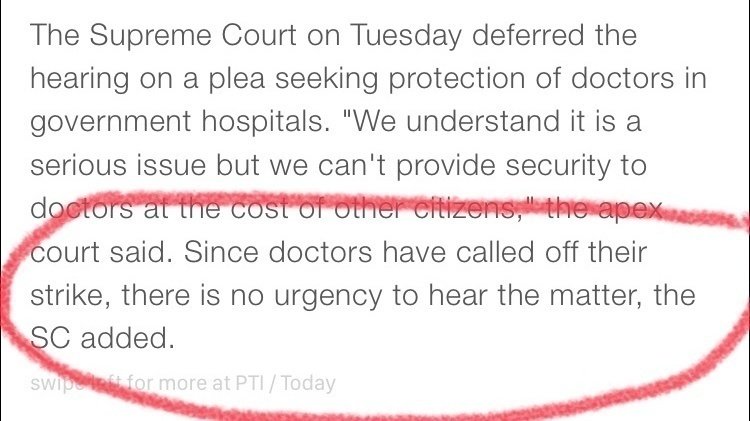 Since the strike has been called off, the supreme court finds that doctors security is not urgent. Sine they are in vacation, the matter will be dealt with after vacations are over.