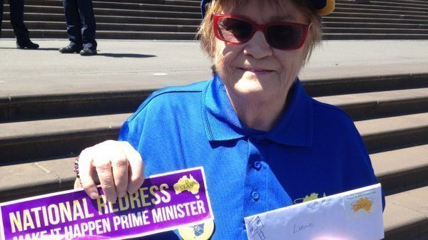 Valda Hogan, a survivor of child slave labour within the Catholic System in Melbourne, is pictured protesting outside the Cathedral in Melbourne Victoria Australia, where George Pell and Denis Hart repeatedly denied her justice, and any support for over 25 years.