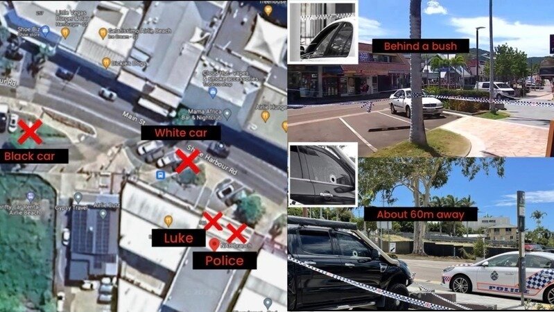 You can see from these photos showing the approximate location of Luke with the 2 cops in front of him and the 2 vehicles that bullets went through behind him….you can clearly see that the white car is behind a bush and out of the sight of both cops and the black car was far away and has tinted windows.