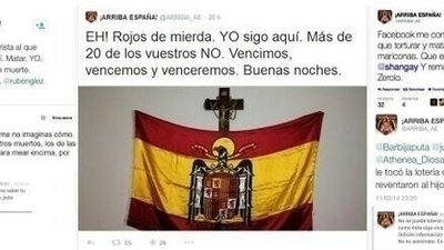 "EH! Rojos de mierda. YO sigo aquí. Más de 20 de los vuestros NO. Vencimos, vencemos y venceremos. Buenas noches. "
