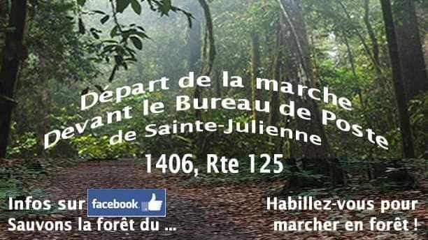 Bonjour à tous ! Je suis fière de vous inviter à une marche en forêt pour sauver la forêt du prolongement de la 25, le samedi 2 avril 2022 à 13h . Point de rendez-vous du départ de la marche : 1406 QC-125 , Sainte-Julienne , QC J0K 2T0. On vous attend en grand nombre et je vous remercie d'avance de votre participation !!! À bientôt !