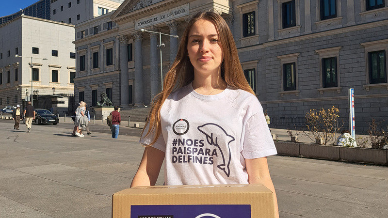 España es la mayor cárcel de delfines de Europa: 1 de cada 3 delfinarios del continente están en nuestro país, donde más de 100 cetáceos viven dando vueltas en tanques que son unas 200.000 veces más pequeños que su área de distribución en la naturaleza. Hoy estoy aquí para decirles a nuestros representantes políticos que tienen que actuar para que esta sea la última generación de delfines y orcas que vive en cautividad en España.