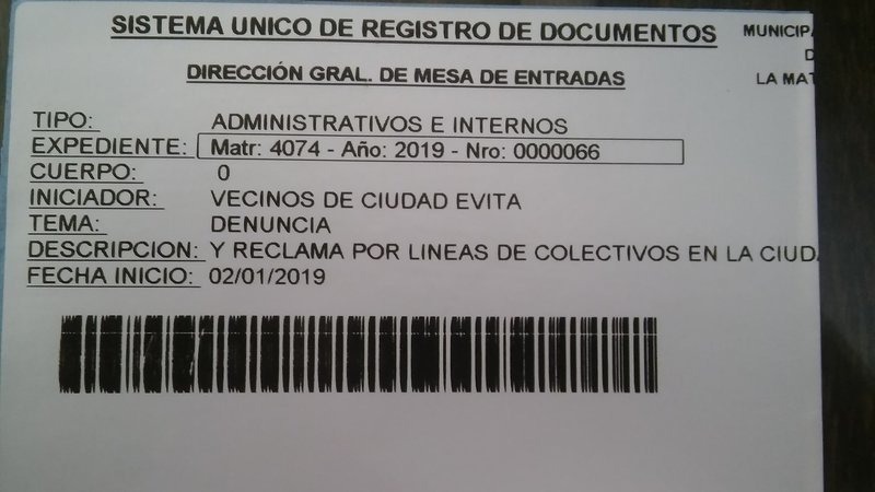 Entre todos debemos concurrir a Peru 2250 San Justo a partir del 21 de Enero con el numero de Expte que aparece en la foto. De 8.30 a 13.30 hs. A partir de esa fecha estaria lista la propuesta de las autoridades para resolver los problemas de transporte de nuestra comunidad. Insistamos!