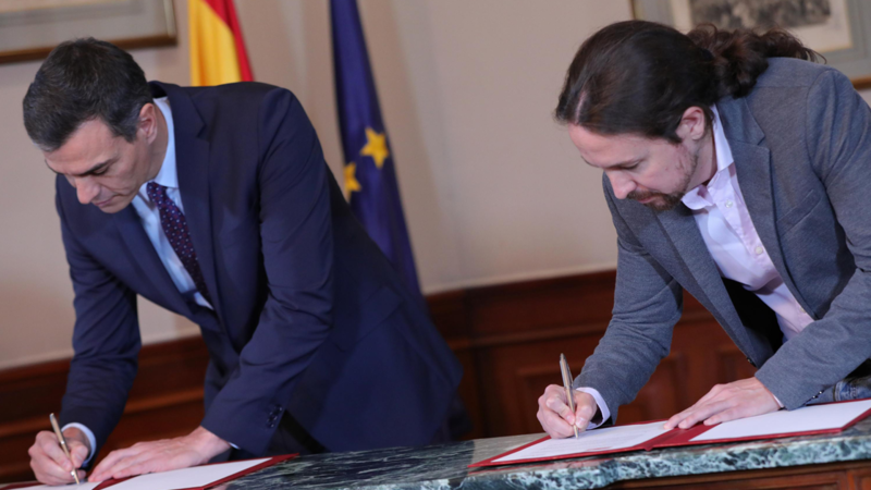 Pedro Sánchez (PSOE) y Pablo Iglesias (Unidas Podemos) han rubricado el preacuerdo para un Gobierno de coalición "rotundamente progresista" que han considerado un proyecto "ilusionante".