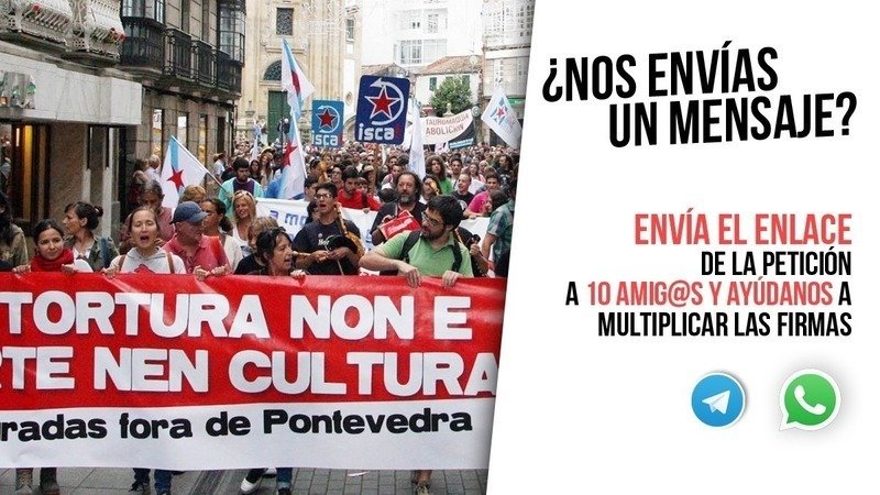 Necesitamos tu Whatsapp y tu Telegram. Ayúdanos a multiplicar el número de firmas de la petición para erradicar las corridas de toros en la última ciudad de Galicia.