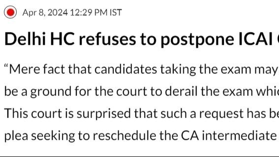 As you may be aware, a petition was filed to postpone the CA exams of May 2024. However, the Hon'ble Delhi High Court has refused to grant the petition, stating that the exams will take place as scheduled. The court also expressed surprise that such a petition was filed in the first place.