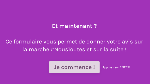 - Et maintenant ? Après l'incroyable réussite des marches #NousToutes samedi 23 novembre, comment allons-nous être utiles ? Quelles devraient être nos priorités pour l'année à venir ? Nous vous proposons de répondre à un formulaire en ligne (3 minutes maximum) pour donner votre avis sur la suite !