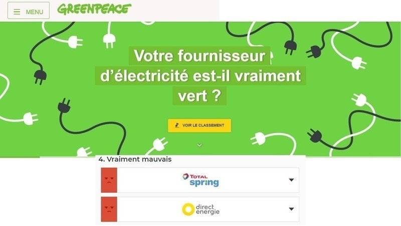 Greenpeace a dévoilé vendredi 28 septembre 2018 son classement des fournisseurs d’électricité "verte", pour permettre aux consommateurs de s’y retrouver, et a mis un zéro pointé aux géants du secteur EDF, Engie ou Direct Energie et Total.