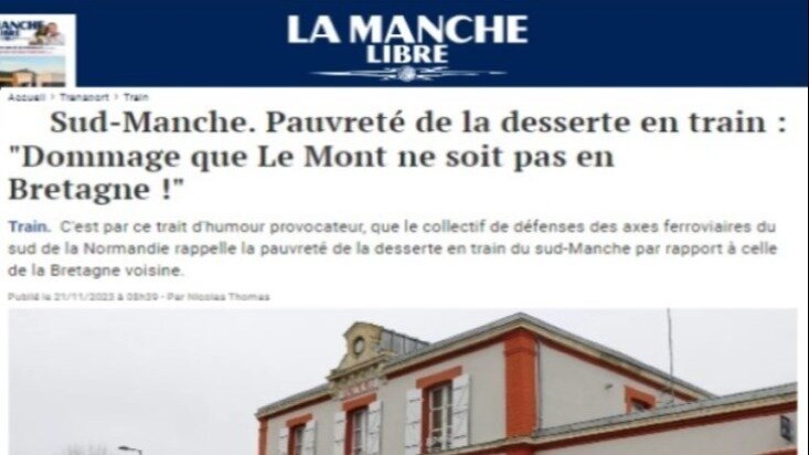"Alors que du côté de la Normandie perdurent des réticences pour améliorer la desserte du sud-Manche qui n'est assurée que par deux allers et retours par jour, la Région Bretagne vient de décider d'augmenter le cadencement sur la liaison Rennes-Saint-Malo via Dol. Les usagers de cet axe vont passer de 17 à 19 allers et retours au quotidien dont deux TGV vers Paris. Nous pourrions dire par humour : dommage que le Couesnon n'ait pas mis le Mont Saint-Michel en Bretagne, certainement que Pontorson, sa gare de destination aurait été mieux desservie !"