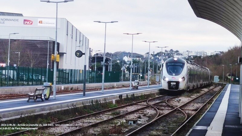Sur la photo, arrivée à Granville ce lundi 16 décembre 2024, à 9h.36 de la 1ère circulation du TER 3403, parti de Paris Montparnasse à 6h.02.
