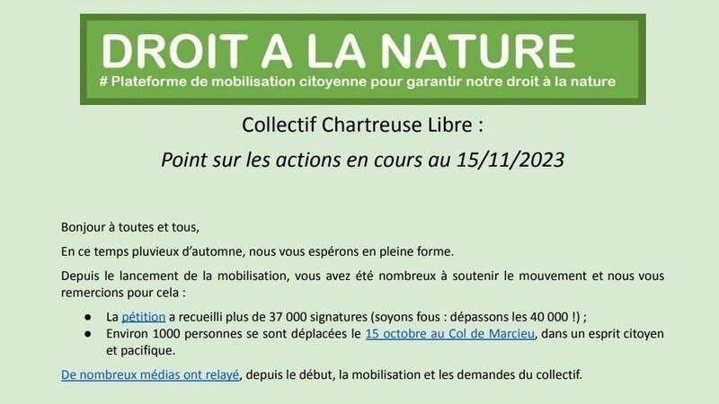 Pour en savoir plus sur les évolutions sur la situation en Chartreuse et ailleurs et les moyens d'actions que nous mettons en œuvre pour avancer sur nos revendications, voici donc notre première lettre d'info.