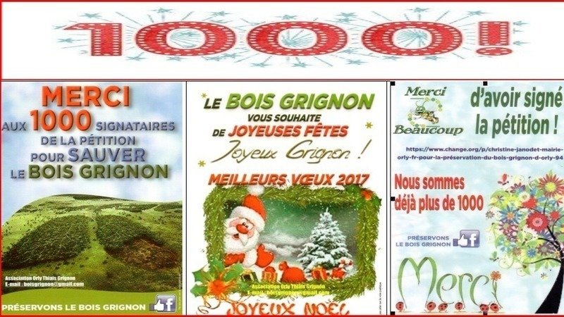 Voici quelques affiches, pour nos sympathisants, afin de fêter la 1000ème signature de la pétition "Préservons le bois Grignon d'Orly ".