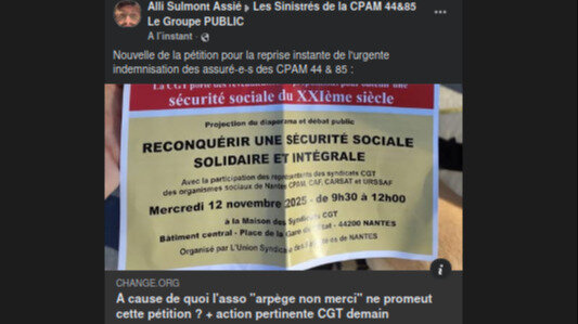 Actualización sobre la peticiónPour l'indemnisation satisfaisante des assuré-e-s des CPAM 44 & 85À cause de quoi "les sinistrés de la cpam 44 & 85" bloque cette pétition sur leur groupe-facebook ?