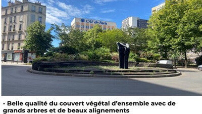 La forte végétalisation du lieu n’a pas attendu la municipalité actuelle. Elle est déjà présente depuis la création du rond-point. C’est à cette époque qu’ont été plantés les quarante-neuf arbres existants. Cent mètres cubes de terre végétale ont été apportés pour installer les parterres fleuris. Le projet actuel ne propose aucun gain significatif en termes de surface végétale puisque le terre-plein central végétalisé doit disparaître.