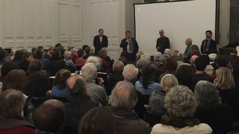 Avant l’ouverture des portes, la capacité de la salle prévue était déjà dépassée. Les services de la mairie ont dû bloquer les invités à l’entrée principale et installer des chaises supplémentaires. 150 personnes se sont serrées dans la salle. Autant ont dû renoncer à assister à la projection. Parents, anciens élèves et collègues, responsables politiques, associatifs et syndicaux ont répondu massivement à l’appel.