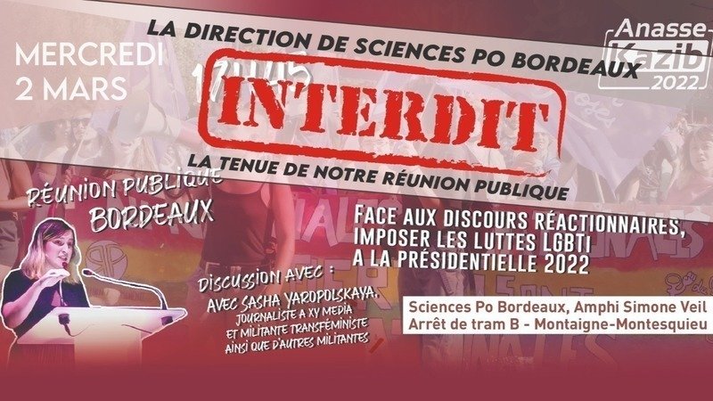 Mercredi 2 mars à 17H45 devait avoir lieu à l'IEP de Bordeaux une réunion publique avec Sasha Yaropolskaya, militante transféministe et co-fondatrice de XY Media afin de discuter de la place des luttes LGBTI dans des présidentielles à venir et à quelques jours du 8 mars.