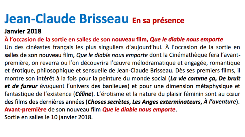 De plus, en s'attardant sur la page 34 de leur programme pour la saison 2017/2018, on découvre qu’une rétrospective des films de Jean-Claude Brisseau se tiendra, en présence du réalisateur, en janvier 2018. Jean-Claude Brisseau oui, vous ne rêvez pas, il s'agit bien du réalisateur condamné pour le harcèlement sexuel de plusieurs actrices en 2005, puis pour agression sexuelle en 2006. Une plainte a été également été déposée contre lui pour viol.