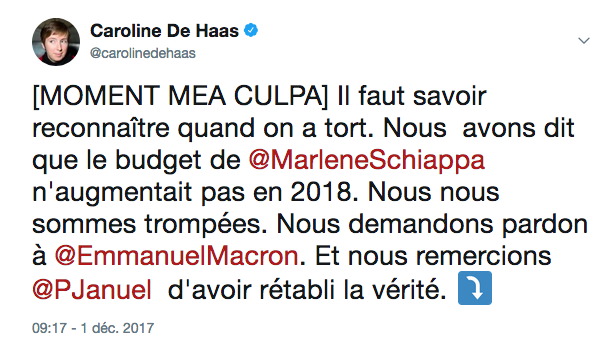 Lorsque l'on se trompe, il faut savoir le reconnaître. Et là, c'est le cas. Nous sommes plusieurs féministes à avoir annoncé que le budget des droits des femmes n'augmentait pas en 2018.