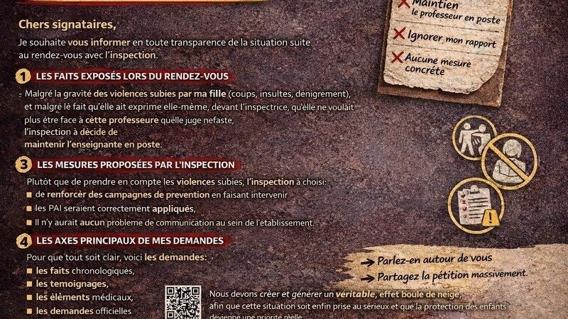 Malgré la gravité des violences subies par ma fille (coups de poings à la tete, coups de pieds dans le ventre, insultes, dénigrement), et malgré le fait qu’elle ait exprimé elle-même, devant l’inspectrice, qu’elle ne voulait plus être face à cette professeure qu’elle juge néfaste, l’inspection a décidé de maintenir l’enseignante en poste.