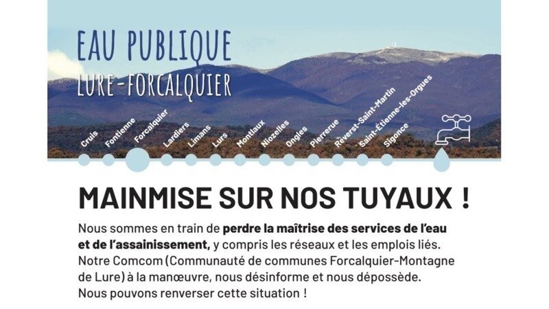 Ce tract explique la situation qui, par un déni de démocratie caractérisé, menace la maîtrise de notre eau et le rapport qualité/prix des services. Il démontre aussi notre intérêt à conserver la régie publique des réseaux d'eau et d'assainissement. Il invite enfin la population à venir en discuter et rencontrer des experts du sujet les 2 et 16 février, respectivement à Montlaux et à Niozelles.