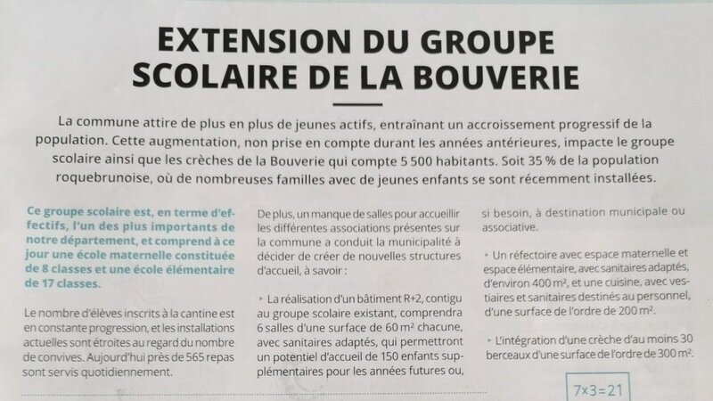 La semaine dernière s'est tenu le bilan de mi-mandat de la mairie actuelle. N'hésitez pas à écrire votre avis sur les conséquences de l'extension de l'école de la bouverie, travaux qui dureront 3 ans, pour les bébés de la crèche et les enfants de la maternelle et de l'élémentaire, nuisance de la qualité d'apprentissage à cause de pollution sonore et pollution de l'air, dangerosité du chantier, problème de circulation et stationnement. Départ d'enseignants de qualité ne voulant pas enseigner dans ces conditions... Quel avenir pour nos enfants? pour cette école? pour la Bouverie? Vous lirez dans la photo jointe, issue du magazine communal "roq'info" que cette extension permettra d'accueillir 150 enfants supplémentaires... Actuellement 660 élèves, cela passerait à 810!!! soit la taille d'un collège!